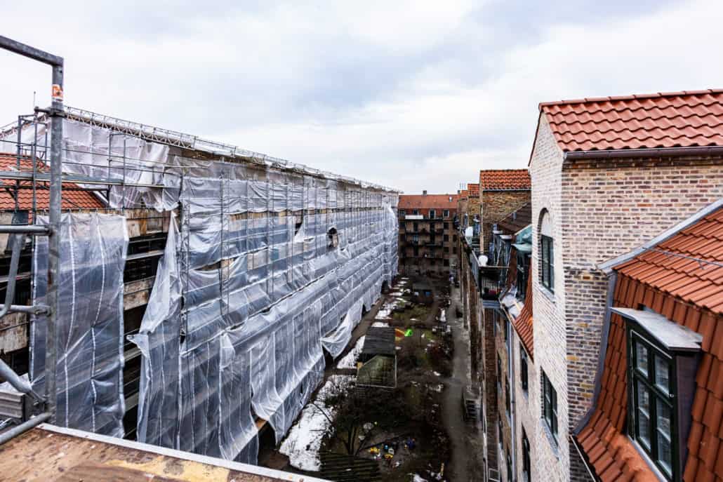På Vennemindsvej på Østerbro i København, er WMH Entreprise A/S i fuld gang med at udskifte 3700 m2 tegltag, udskifte opgangsvinduer samt renovere fuger på gårdfacader